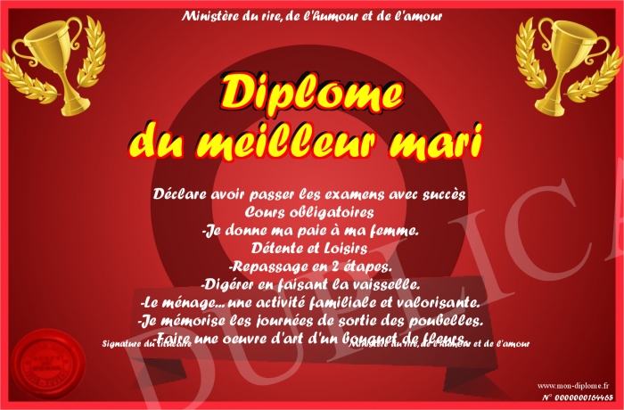 Envoyez par email votre Diplôme du meilleur mari personalisé