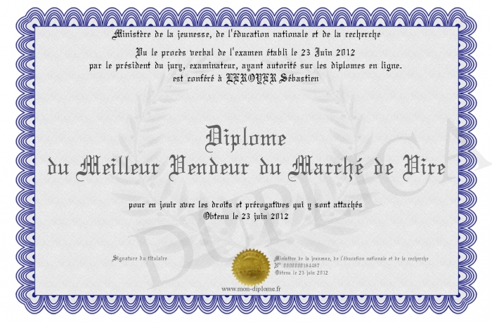 Envoyez par email votre Diplôme du Meilleur Vendeur du Marché de Vire personalisé