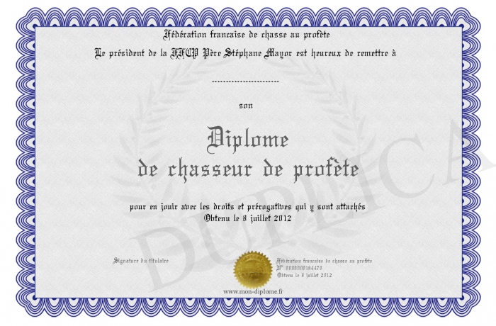 Envoyez par email votre Diplôme de chasseur de profète personalisé