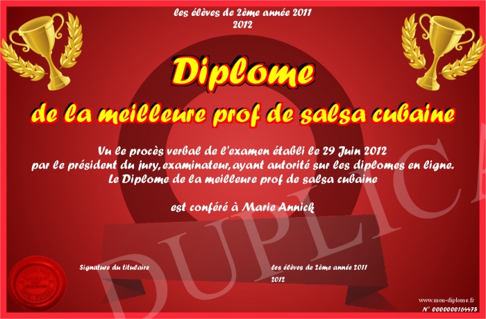 Envoyez par email votre Diplôme de la meilleure prof de salsa cubaine personalisé
