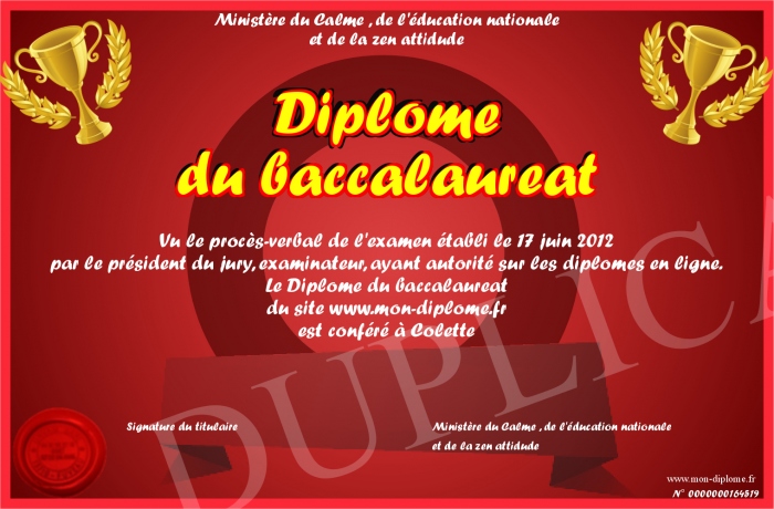 Envoyez par email votre Diplôme du baccalaureat personalisé