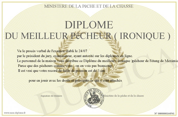 Envoyez par email votre Diplôme du meilleur pêcheur ( ironique ) personalisé