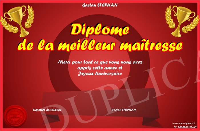 Envoyez par email votre Diplôme de la meilleur maîtresse personalisé