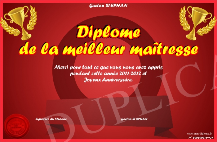 Envoyez par email votre Diplôme de la meilleur maîtresse personalisé
