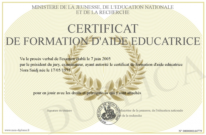 Envoyez par email votre certificat de formation d'aide educatrice personalisé