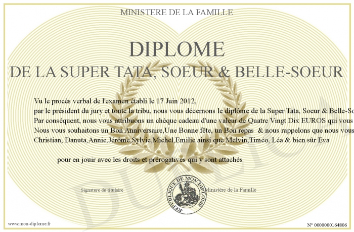 Envoyez par email votre Diplôme de la Super Tata, Soeur & Belle-Soeur personalisé