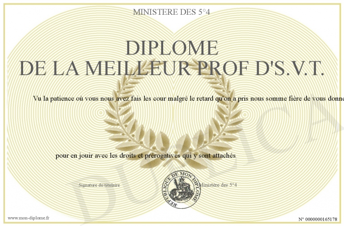 Envoyez par email votre Diplôme de la meilleur prof d'S.V.T. personalisé