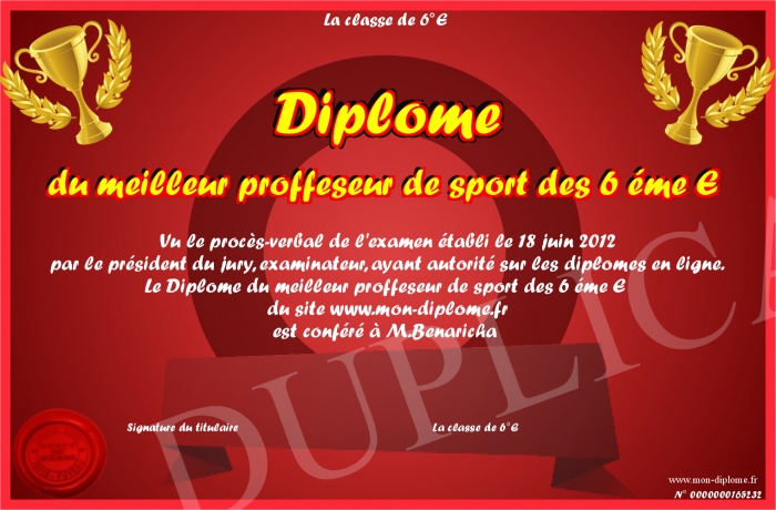 Envoyez par email votre Diplôme du meilleur proffeseur de sport des 6 éme E personalisé