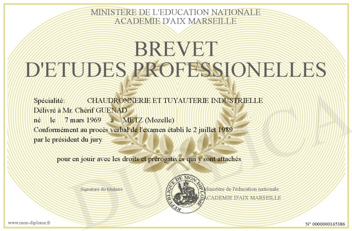 Envoyez par email votre BREVET D'ETUDES PROFESSIONELLES personalisé