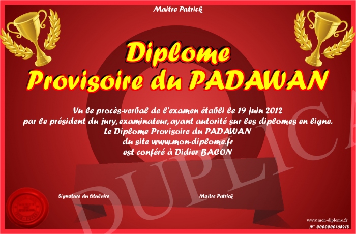 Envoyez par email votre Diplome Provisoire du PADAWAN personalisé