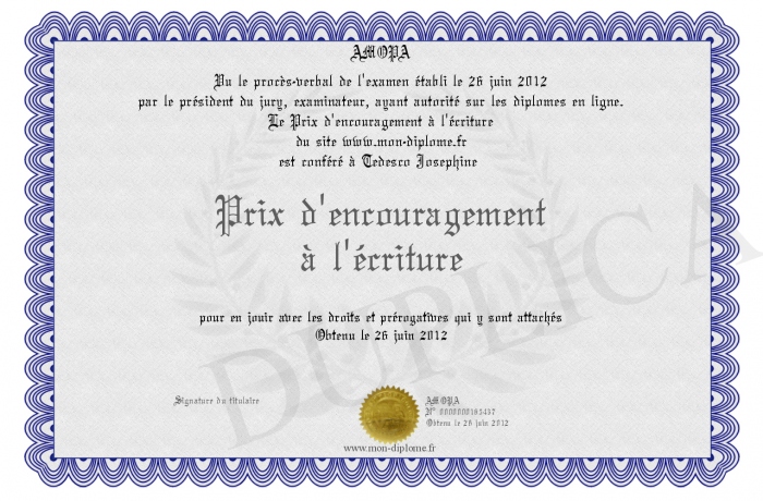 Envoyez par email votre Prix d'encouragement à l'écriture personalisé