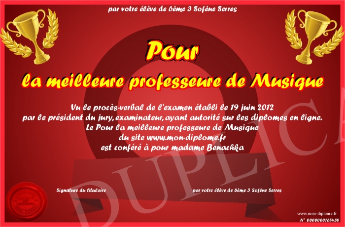 Envoyez par email votre Pour la meilleure professeure de Musique personalisé