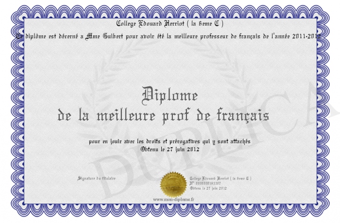 Envoyez par email votre Diplôme de la meilleure prof de français personalisé