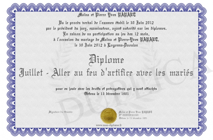 Envoyez par email votre Diplôme Juillet - Aller au feu d'artifice avec les mariés personalisé