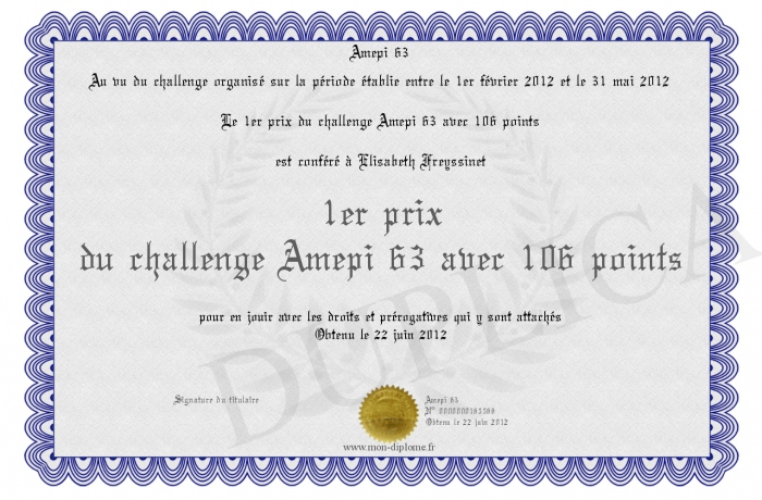 Envoyez par email votre 1er prix du challenge Amepi 63 avec 106 points personalisé