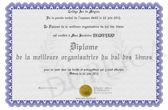 Envoyez par email votre Diplôme de la meilleure organisatrice du bal des 3èmes personalisé