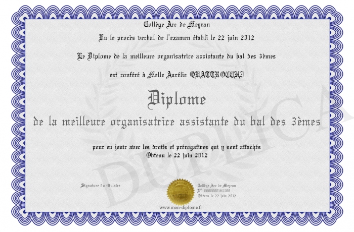 • Diplôme de la meilleure organisatrice assistante du bal des 3èmes