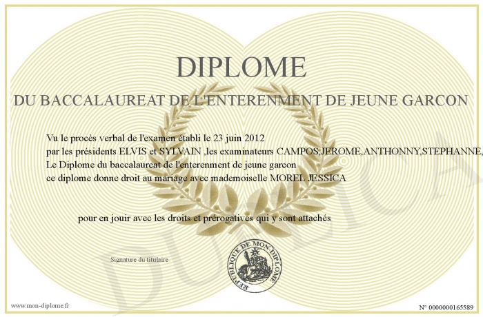 Envoyez par email votre Diplôme du baccalaureat de l'enterenment de jeune garcon personalisé