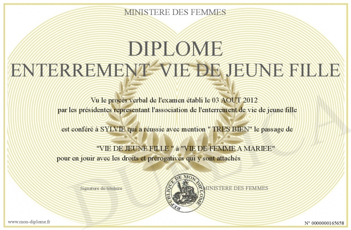 Envoyez par email votre DIPLOME ENTERREMENT VIE DE JEUNE FILLE personalisé