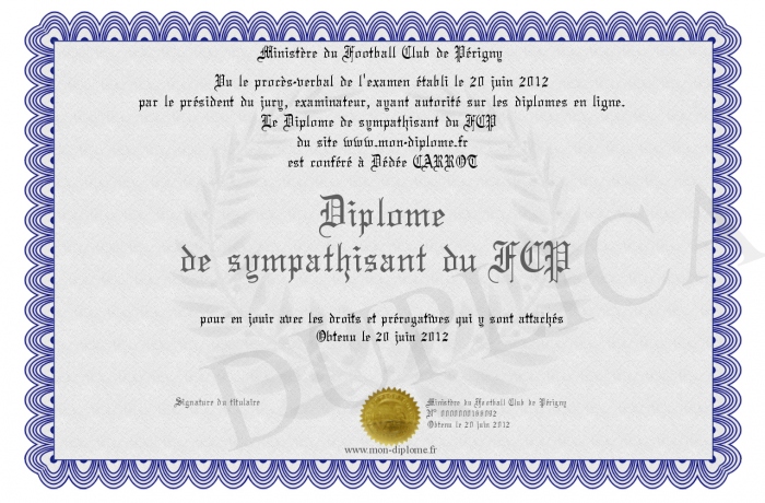 Envoyez par email votre Diplôme de sympathisant du FCP personalisé