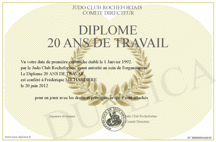 Envoyez par email votre Diplôme 20 ANS DE TRAVAIL personalisé
