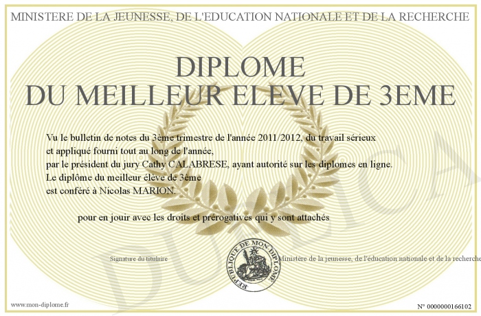 Envoyez par email votre Diplôme du Meilleur élève de 3ème personalisé