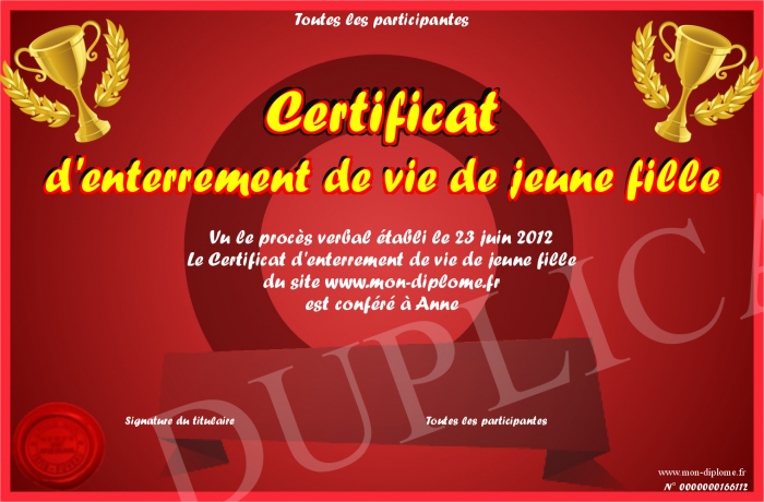 Envoyez par email votre Certificat d'enterrement de vie de jeune fille personalisé