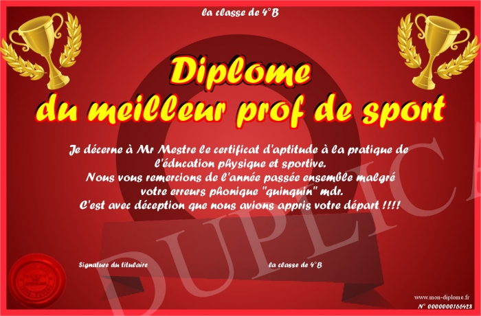 Envoyez par email votre Diplôme du meilleur prof de sport personalisé