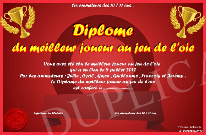 Envoyez par email votre Diplôme du meilleur joueur au jeu de l'oie personalisé