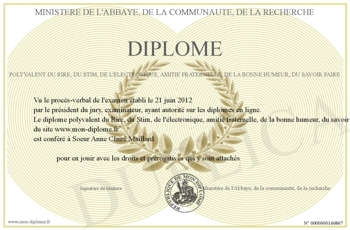 Envoyez par email votre diplôme polyvalent du Rire, du Stim, de l'électronique, amitié fraternelle, de la bonne humeur, du savoir faire personalisé