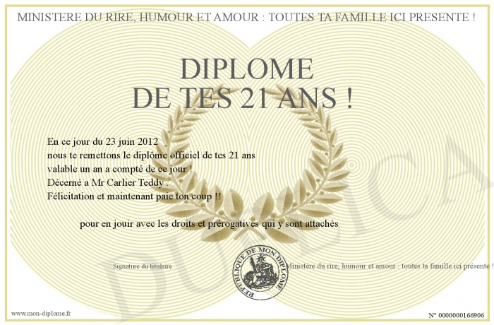 Envoyez par email votre Diplome de tes 21 ans ! personalisé