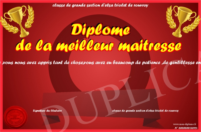 Envoyez par email votre Diplôme de la meilleur maitresse personalisé