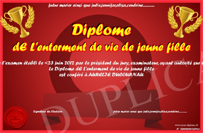 Envoyez par email votre Diplôme dE L'enterment de vie de jeune fille personalisé