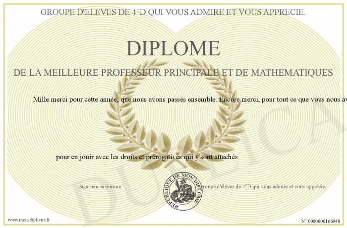 Envoyez par email votre Diplôme de la meilleure professeur principale et de mathématiques personalisé