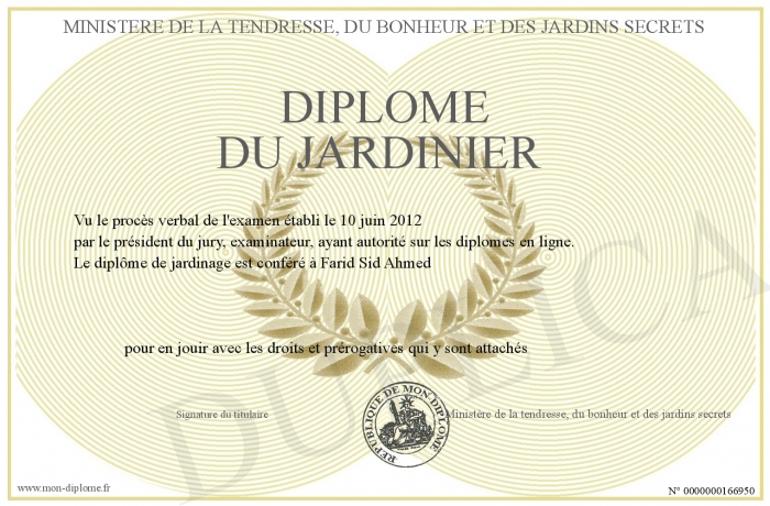 Envoyez par email votre Diplôme du jardinier personalisé