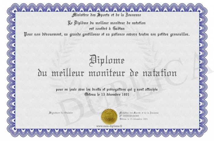 Envoyez par email votre Diplôme du meilleur moniteur de natation personalisé