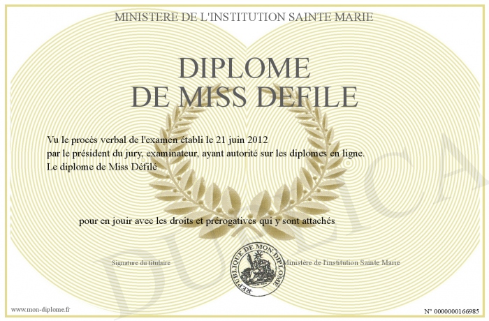 Envoyez par email votre Diplôme de Miss Défilé personalisé