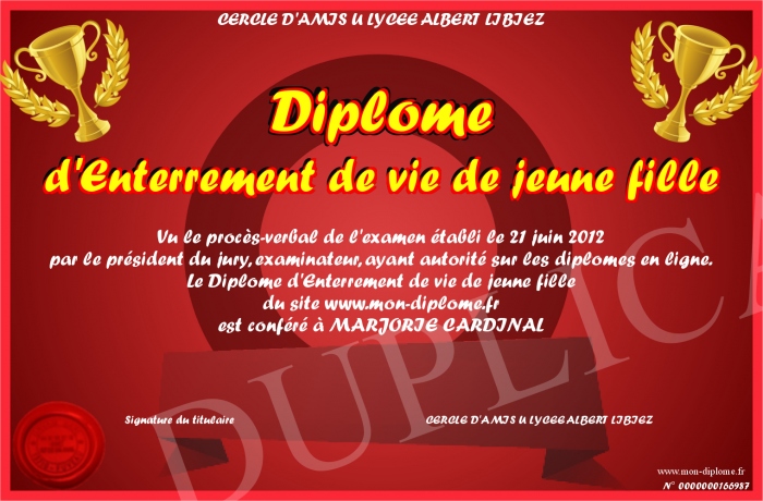 Envoyez par email votre Diplome d'Enterrement de vie de jeune fille personalisé