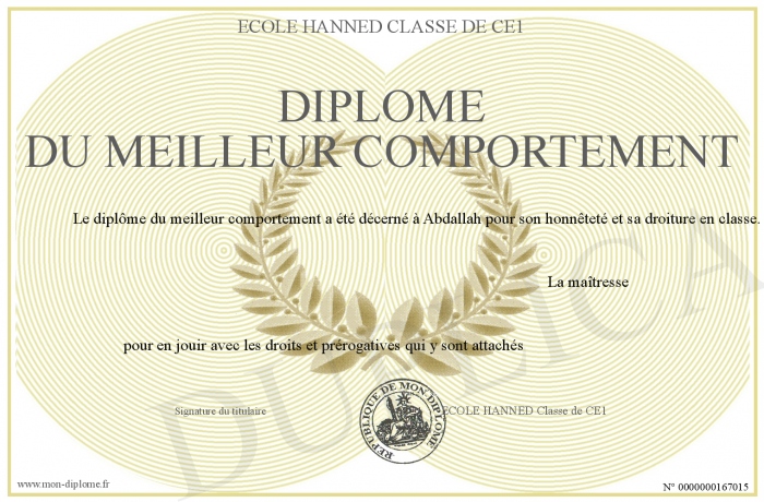 Envoyez par email votre DIPLOME DU MEILLEUR COMPORTEMENT personalisé