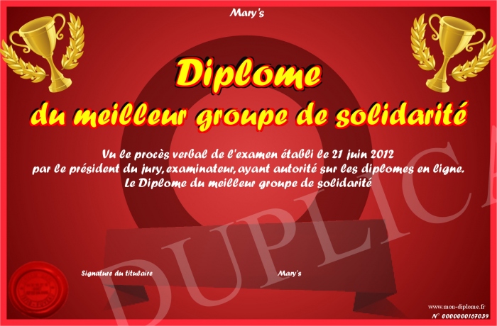 Envoyez par email votre Diplome du meilleur groupe de solidarité personalisé