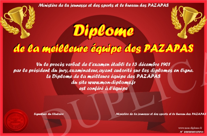 Envoyez par email votre Diplôme de la meilleure équipe des PAZAPAS personalisé