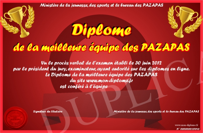 Envoyez par email votre Diplôme de la meilleure équipe des PAZAPAS personalisé