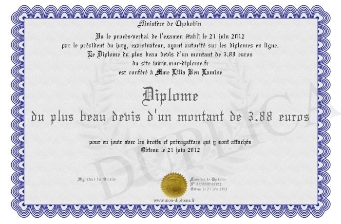 Envoyez par email votre Diplôme du plus beau devis d'un montant de 3.88 euros personalisé