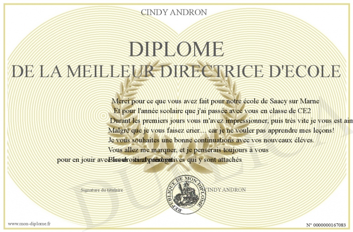 Envoyez par email votre Diplôme de la meilleur Directrice d'école personalisé