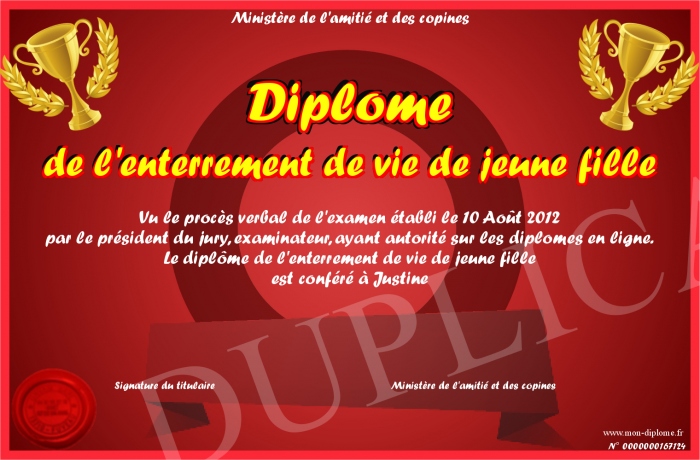 Envoyez par email votre Diplôme de l'enterrement de vie de jeune fille personalisé