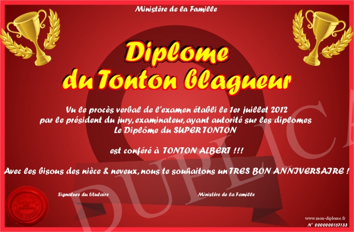Envoyez par email votre Diplôme du Tonton blagueur personalisé