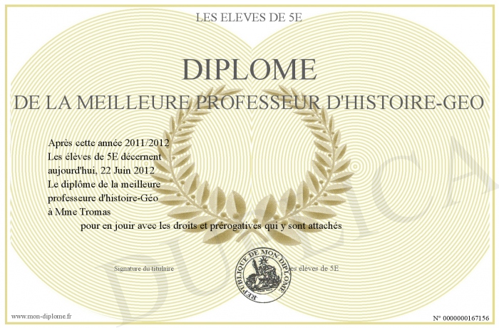 Envoyez par email votre Diplôme de la meilleure professeur d'Histoire-Géo personalisé