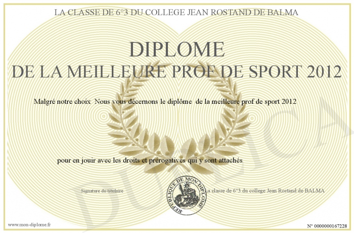 Envoyez par email votre Diplôme de la meilleure prof de sport 2012 personalisé
