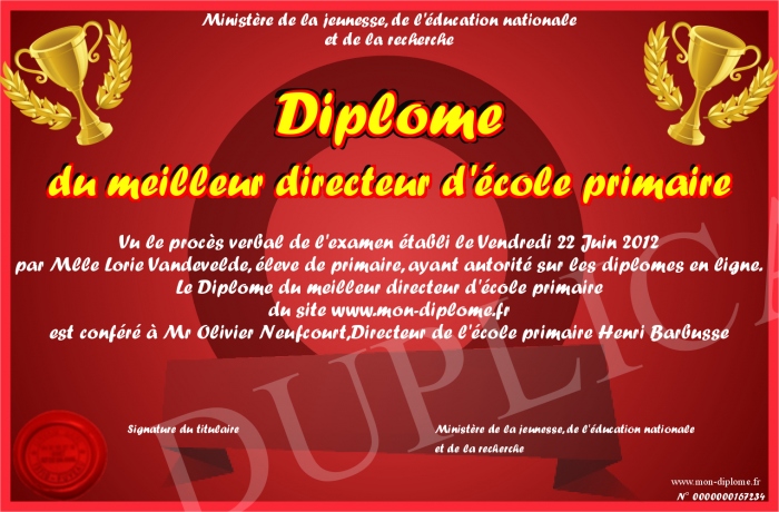 Envoyez par email votre Diplôme du meilleur directeur d'école primaire personalisé