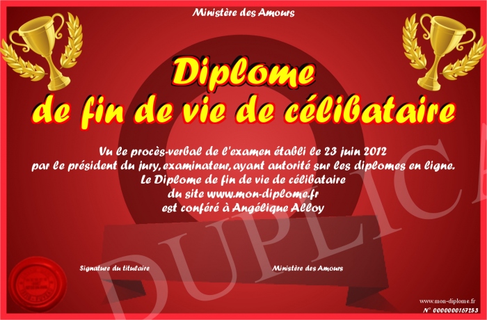Envoyez par email votre Diplôme de fin de vie de célibataire personalisé